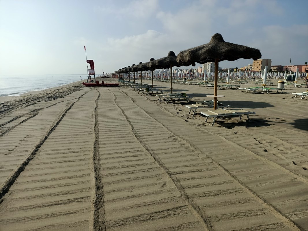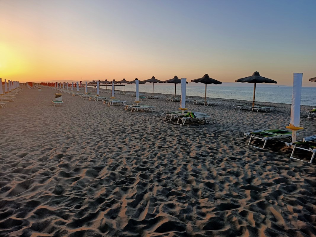 La spiaggia, tra le più grandi della costa, è attrezzata con ombrelloni, sdraio e lettini.